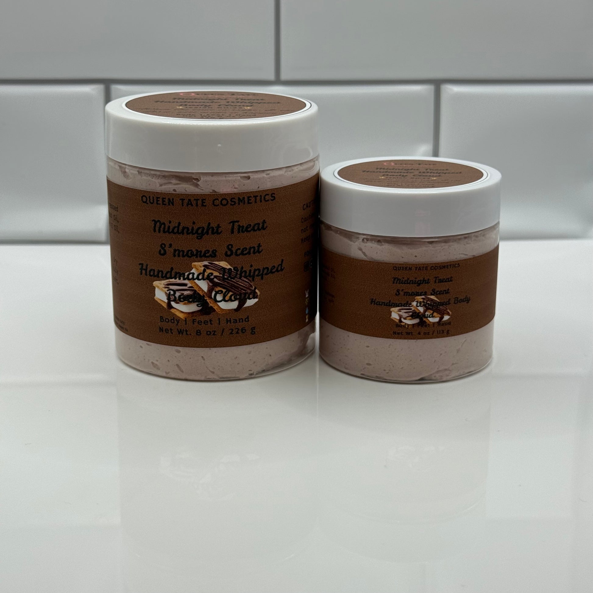 Shea Butter, Mango Butter, Cold Pressed Coconut Oil, Jojoba Oil, Grape seed Oil, Almond Oil, Avocado Oil, Vitamin E Oil, Arrowroot Powder, Fragrance Oil, s’mores.
